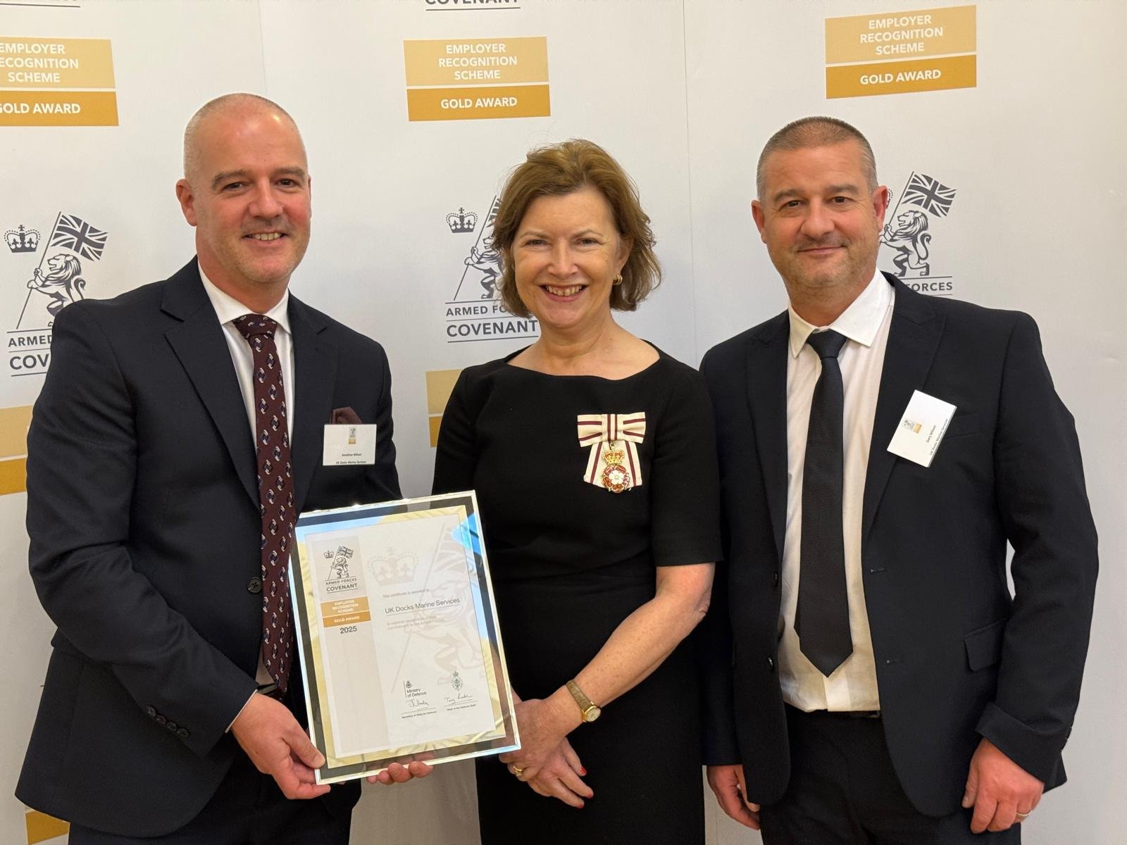 UK Docks Marine Services has been formally presented with a Gold Award under the Armed Forces’ Employer Recognition scheme (ERS), which recognises the highest standards of support for former military personnel.